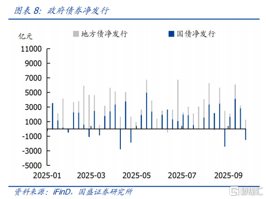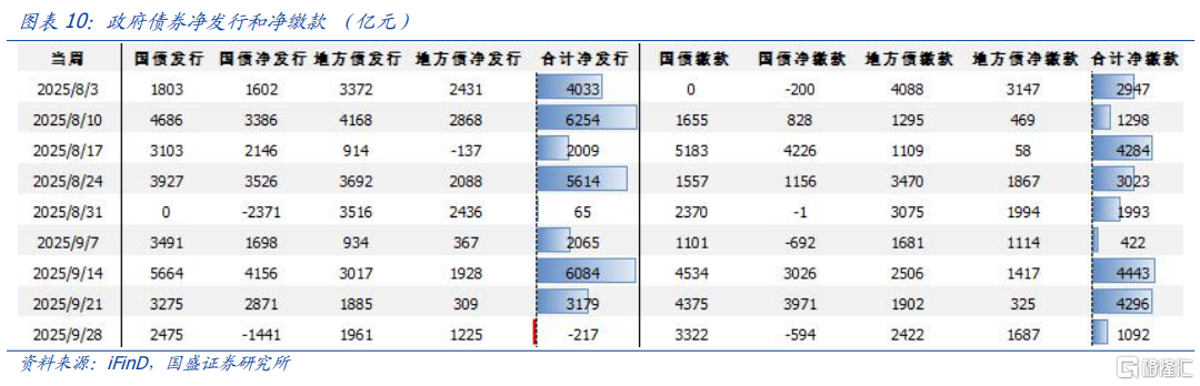 下周政府债券净发行和净缴款均小幅增加。本周国债净发行-1441亿元,地方债净发行1225亿元,政府债券合计净发行-217亿元,净缴款合计1092亿元。下周即将跨月+进入国庆,预计无国债发行,地方债净发行980.81亿元,净缴款合计2120.81亿元。
