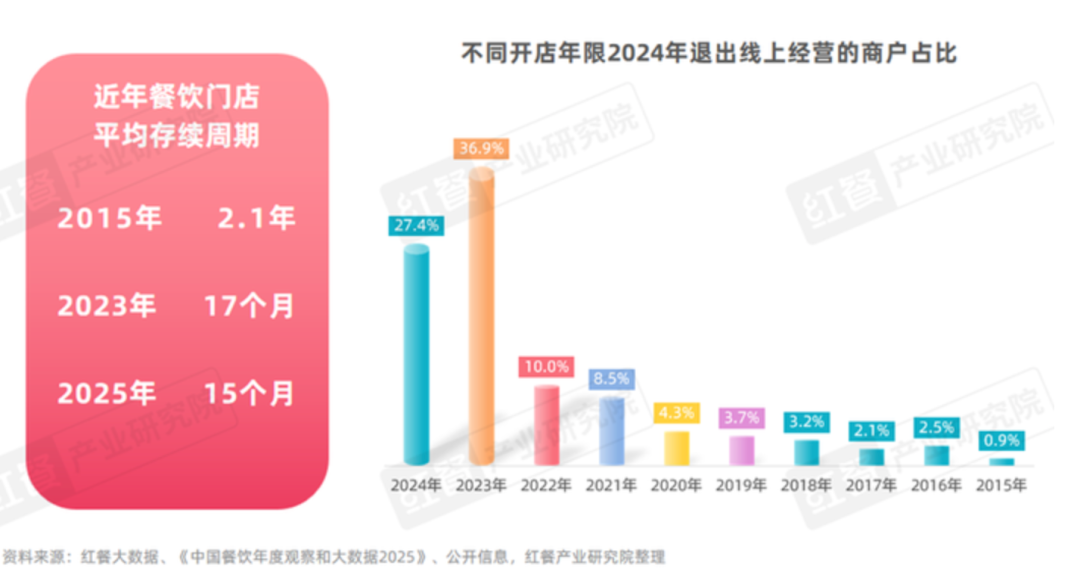 《中国餐饮年度观察和大数据2025》显示,在2024年退出线上经营的商户中,开店年限不足两年的商户占比达到64.3%。整体来看,餐饮商家的生命周期已经从过去的2.1年,下降到15个月。
