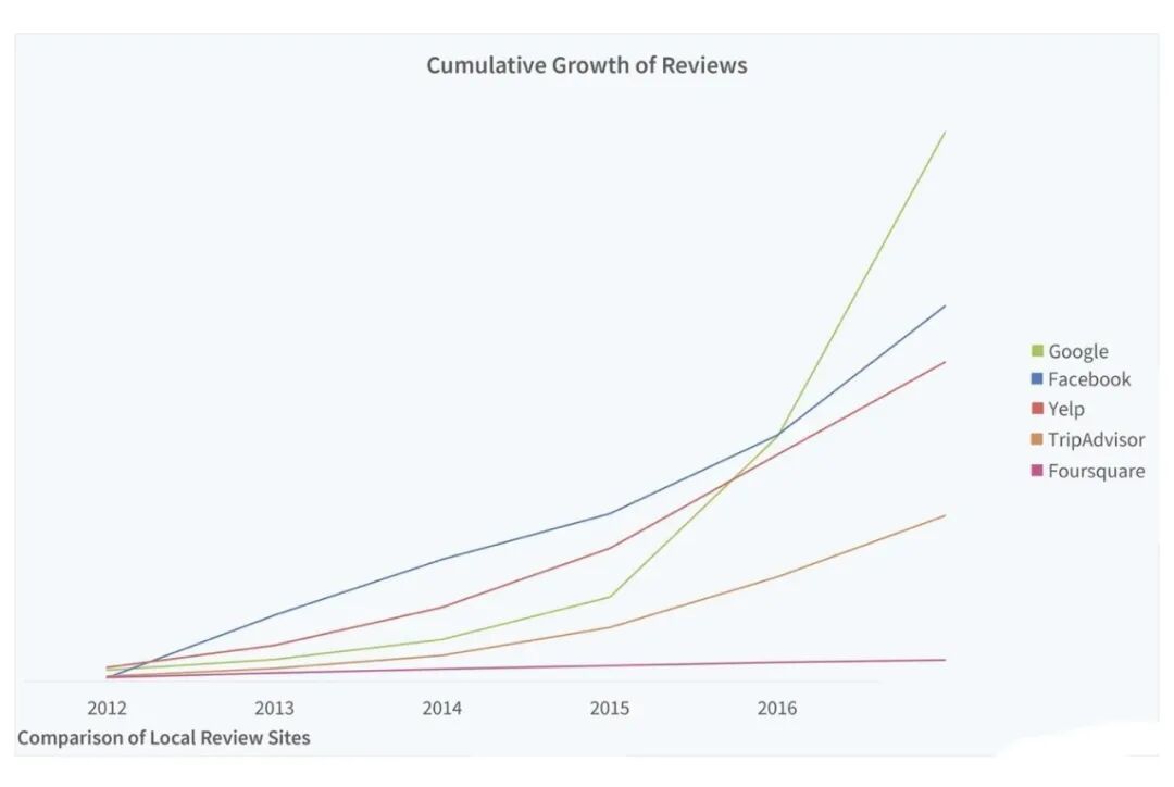 从2011年推出类似Yelp的服务,到2016年,本地商户的评价数整体超过Yelp,谷歌地图仅用五年就大获全胜。