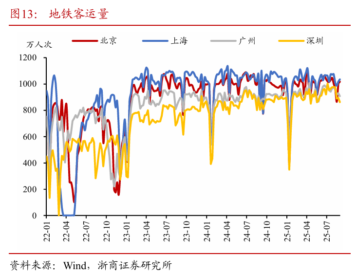 本周出行消费数据相对分化。北京、上海地铁客运量上升,但广州、深圳地铁客运量减少;电影票房收入上升,超过历年同期数据。乘用车零售量上涨,较上月同期上升9.2%。国内执行航班数量减少。