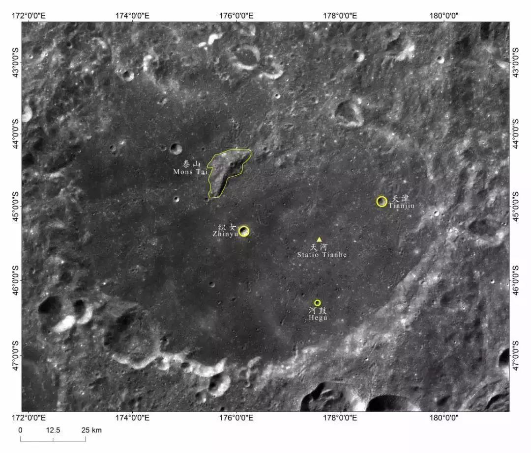 图为嫦娥三号着陆区月球地理实体名称及推广使用的月球地理实体名称。2019年2月4日,国际天文学联合会(IAU)批准了利用探月工程嫦娥二号和嫦娥四号高分辨月面影像数据申报的嫦娥四号着陆点及附近5个月球地理实体名称:天河基地、织女、河鼓、天津、泰山。这是我国月球探测工程科学数据成果在月球地理实体命名上的又一次重要应用。至此,国际天文学联合会(IAU)公布的月球地名中,有27个以中国元素命名的月球地形单元。