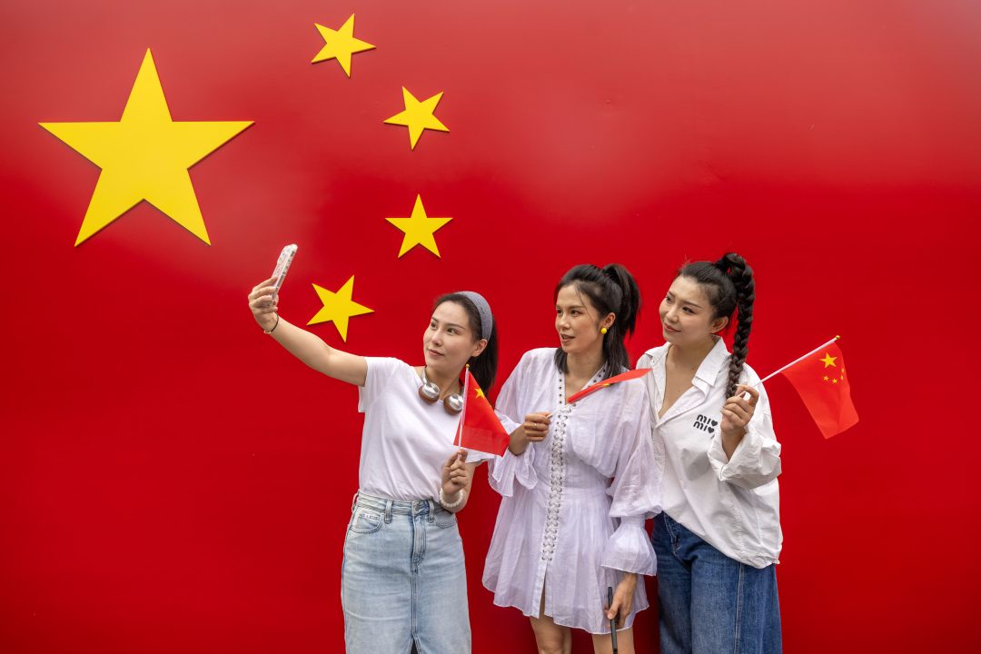 9月27日,江苏省泰州市泰山公园广场,人们与国旗合影留念,迎接国庆节。