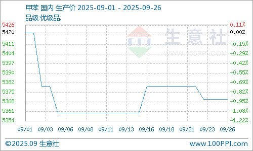 据生意社商品行情分析系统显示,2025年9月甲苯市场震荡下跌。9月1日至26日,国内甲苯市场价格自5420元/吨下跌至5370元/吨,周期内价格下跌0.92%。
