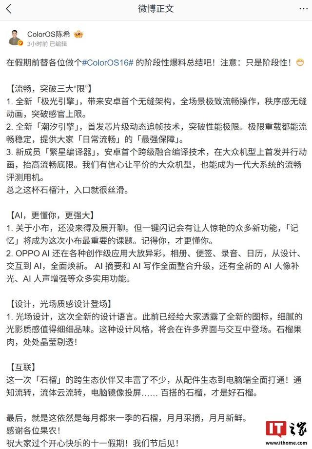 IT之家 9 月 29 日消息,OPPO ColorOS 设计总监陈希今日在微博对 ColorOS 16 系统进行了阶段性爆料总结,包含流畅、AI、设计、互联等方面内容,具体如下: