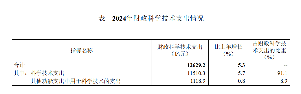 2024年,国家财政科学技术支出12629.2亿元,比上年增加633.3亿元,增长5.3%。其中,中央财政科技支出4192.5亿元,占全国财政科技支出的比重为33.2%;地方财政科技支出8436.7亿元,占比为66.8%。