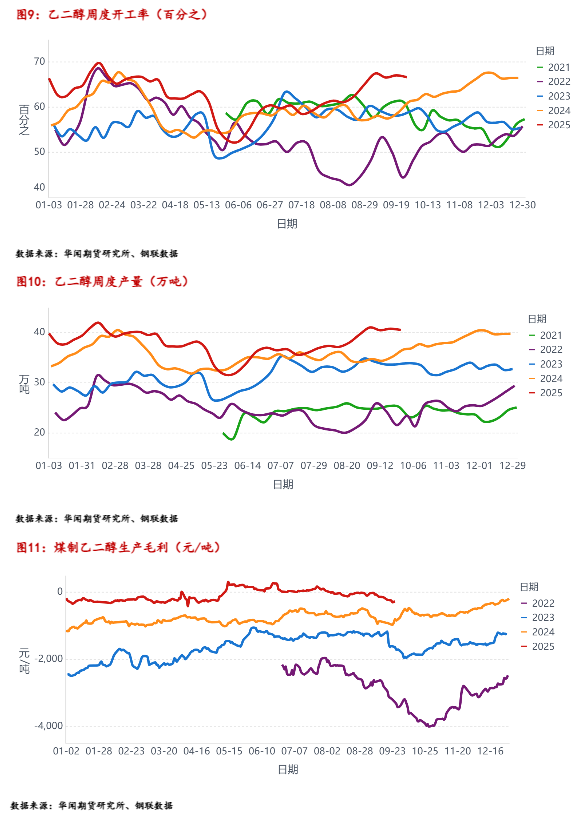 乙二醇周度开工率高位震荡,开工率维持在67%左右,周度平均产量大约在40.5万吨,处于近几年同期偏高水平,煤制及乙烯制乙二醇开工水平均偏高。煤制乙二醇利润水平较好,开工率继续维持高位。九月份,裕龙石化的新装置投产,乙二醇产能增多,强化了供应端压力。从煤制乙二醇的生产毛利来看,仍处于近几年同期高位,较好的利润将促使乙二醇开工水平维持中等偏高水平。
