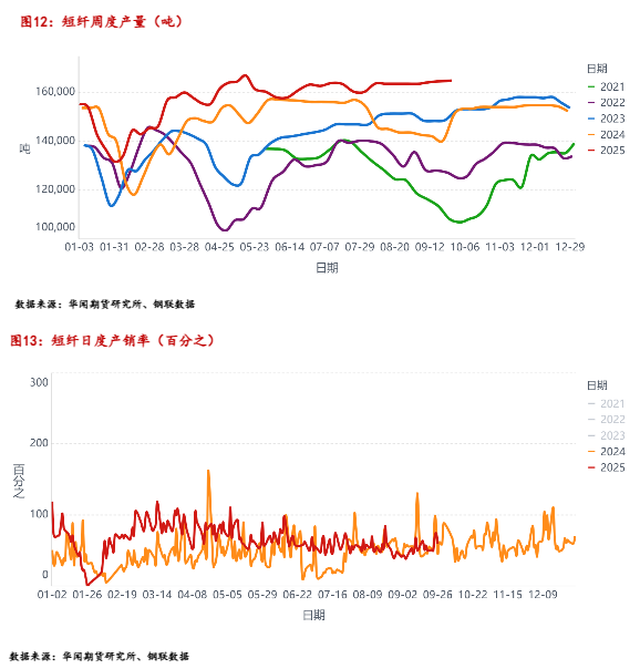 短纤方面,下游涤棉纱及纯涤纱库存震荡变化,厂内短纤库呈现中性,但整体呈现去化走势,供应端较为稳定,预计供需变化较为有限,主要跟随成本端价格变化,关注PTA及乙二醇价格变化。