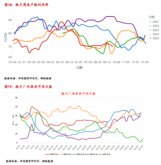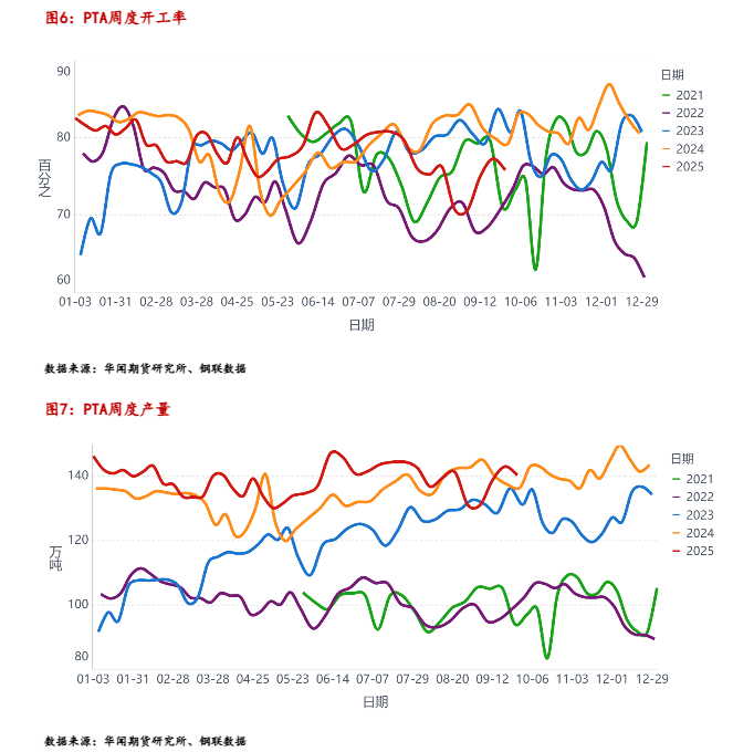 瓶片库存水平整体维持在近几年同期偏高水平,供应及需求处于动态平衡的状态,国内瓶片产能整体较为过剩,厂商为防止库存堆积,下调装置负荷。