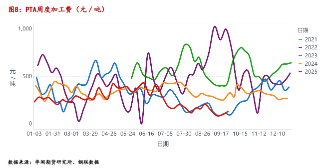 从九月份PTA加工费来看,周度加工费维持低波动,从历史数据来看,当前加工费处于偏低水平,新装置的投产导致PTA生产企业面临的加工费压力进一步增大。