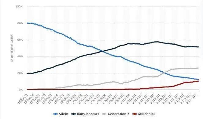 那到底得有多“自豪”呢?根据 2025 年第三季度的统计数据,在美国的财富分布中,婴儿潮整体占据了50%。