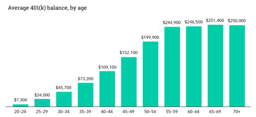 在美国,雇主会提供一种商业养老理财账户,叫做 401(k)。Fidelity作为美国提供这一服务的最大的资产管理公司之一,在 2025 年 3 月公布了不同年龄层 401(k) 账户的平均余额数据: