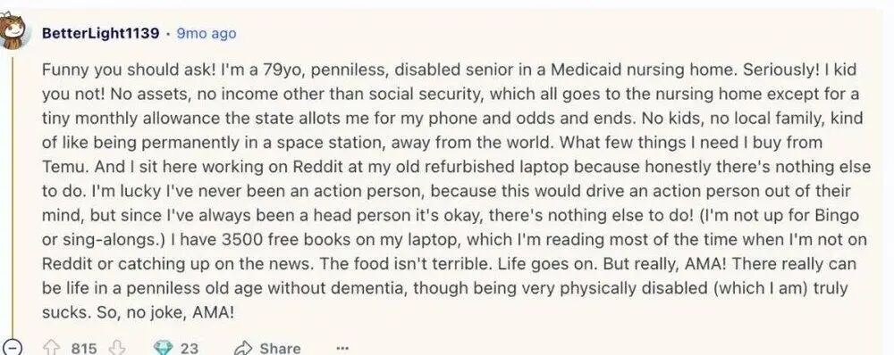 翻译:我是一名 79 岁、身无分文、残疾的老人,现在住在 Medicaid(医疗补助)养老院。真的!我没有开玩笑!没有任何资产,除了社会保障金外没有收入,而那点社会保障金也几乎全部交给了养老院,只有州政府每月给我一小笔津贴,用来付电话费和买些零零碎碎的东西。我没有孩子,也没有在本地的家人,有点像是被永久困在一个空间站里,与世界隔绝。