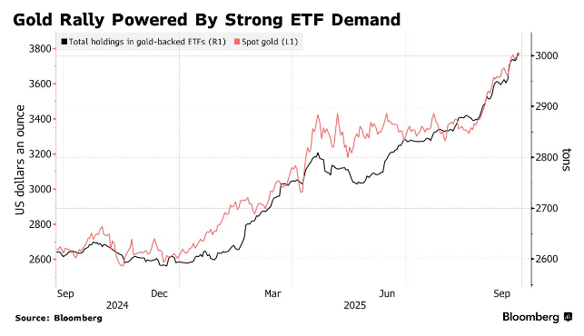 今年以来,金价已飙升逾40%,在各大央行购金需求以及美联储重启降息的推动下,金价接连创下历史峰值。下周金价有望实现连续第三个季度上涨,目前黄金ETF的持仓量已升至2022年以来的最高水平。高盛、德意志银行等机构均表示,预计金价涨势将持续。
