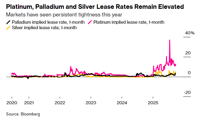 与此同时,其他贵金属今年也出现了前所未有的供应紧张局面。由于连续数年的供应短缺问题日益凸显,伦敦市场可自由流通的贵金属库存不断减少,市场对此的担忧也进一步加剧。白银、铂金与钯金的租赁利率(反映短期借入金属的成本)均大幅攀升,远超接近零的正常水平。