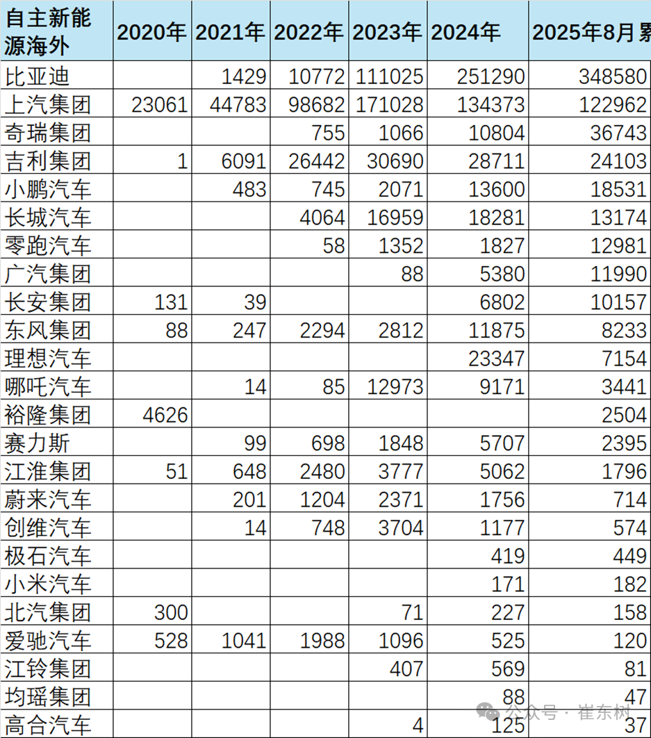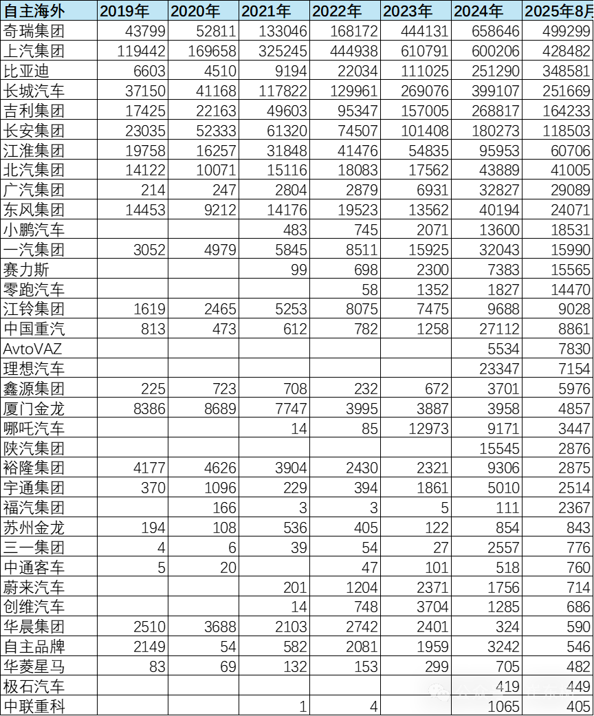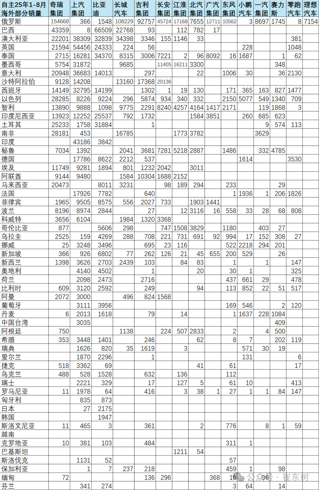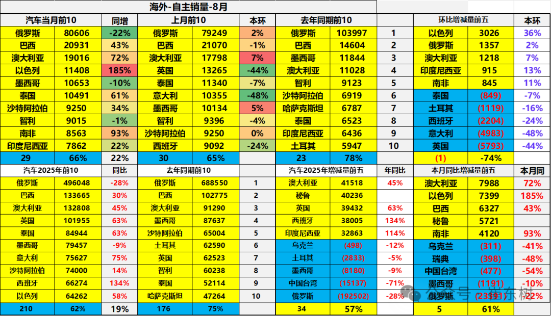 目前2025年1-8月中国自主海外销量同比去年增量的是澳大利亚、秘鲁、英国、西班牙、印尼等,8月自主海外销量的同比去年增量的是澳大利亚、以色列、巴西等。2025年1-8月中国自主海外销量下滑较大的是俄罗斯、中国台湾、墨西哥等市场,其中8月同比下滑的是俄罗斯、墨西哥、中国台湾等。