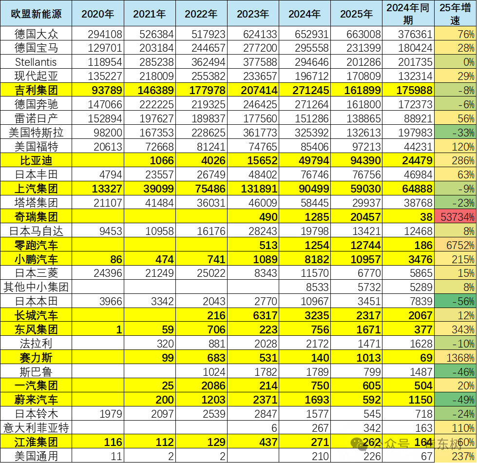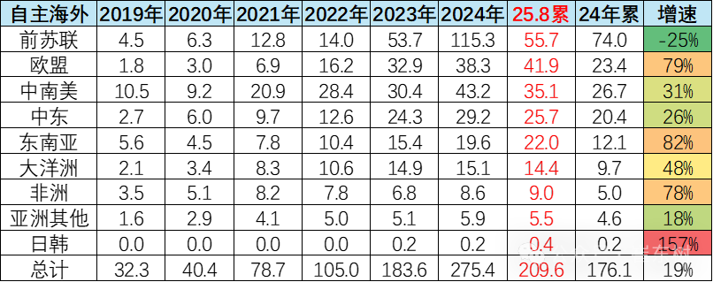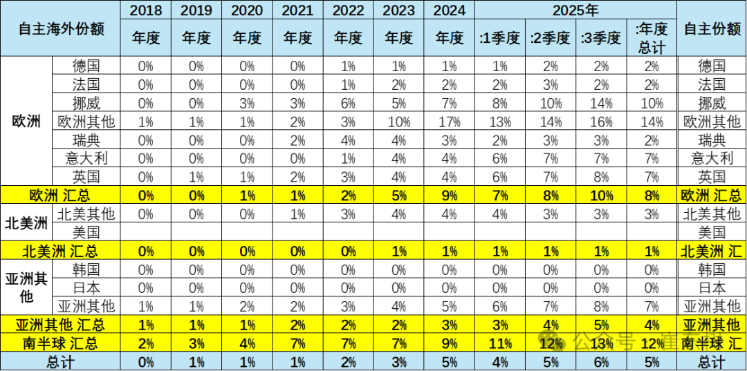 海外增速超强的最主要原因是过去我们的汽车出口很多处于非洲等不发达国家,或者是难以统计的市场,因此海外数据体现的并不是很充分,而现在我们出口体现出在海外的一些高端市场表现更为突出,所以总体可以看到海外数据的中国汽车出口增长速度在2023-2025年呈现强势增长态势,尤其2022年以来中国汽车出口呈现一轮爆发式增长的态势,在欧洲市场呈现连续3年较强增长,2024年走弱,因此2025年在欧盟的市场较强。