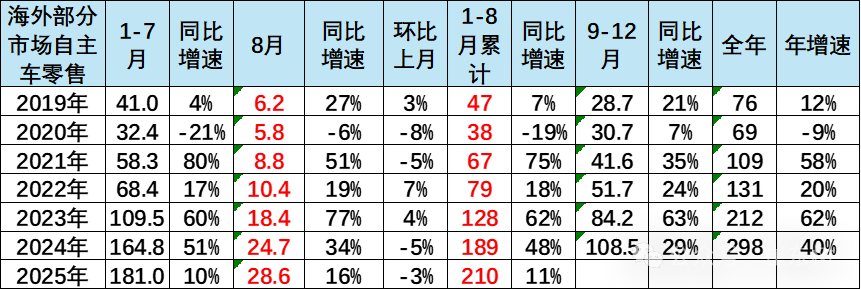 中国自主车企在海外部分地区销量特征较强。2025年8月中国自主车企在海外部分能持续统计的地区的当地销量初步统计达到28.6万台,同比增长16%,环比降3%;2025年1-8月的中国海外市场自主品牌销量210万台,同比增长11%,中国自主的海外部分可统计市场的零售表现很好。