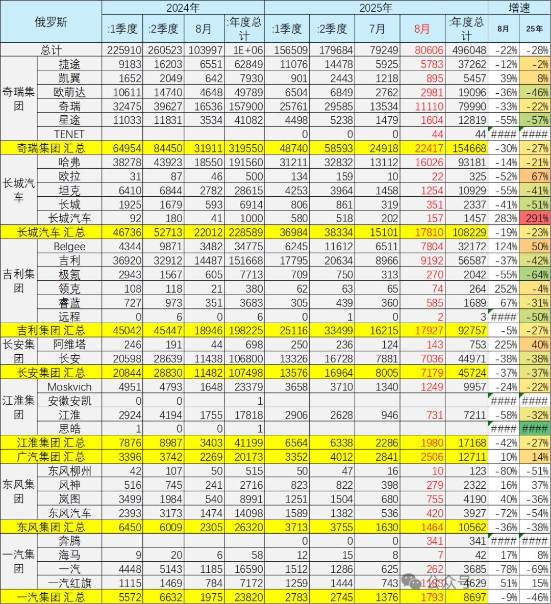 长城汽车在俄罗斯表现相对突出,尤其是哈佛和坦克品牌表现相对较好。哈佛品牌实现了小型燃油车在俄罗斯市场超强发展,类似哈弗初恋等这些车型表现极其优秀。而吉利在俄罗斯的表现也实现了超强的增长,以本土化代工生产的产品和进口车型表现都相对较强,尤其是极氪等产品表现相对也是极其优秀的情况。其它中国车企也很强,北汽等产品在俄罗斯表现也是相对较强的情况。