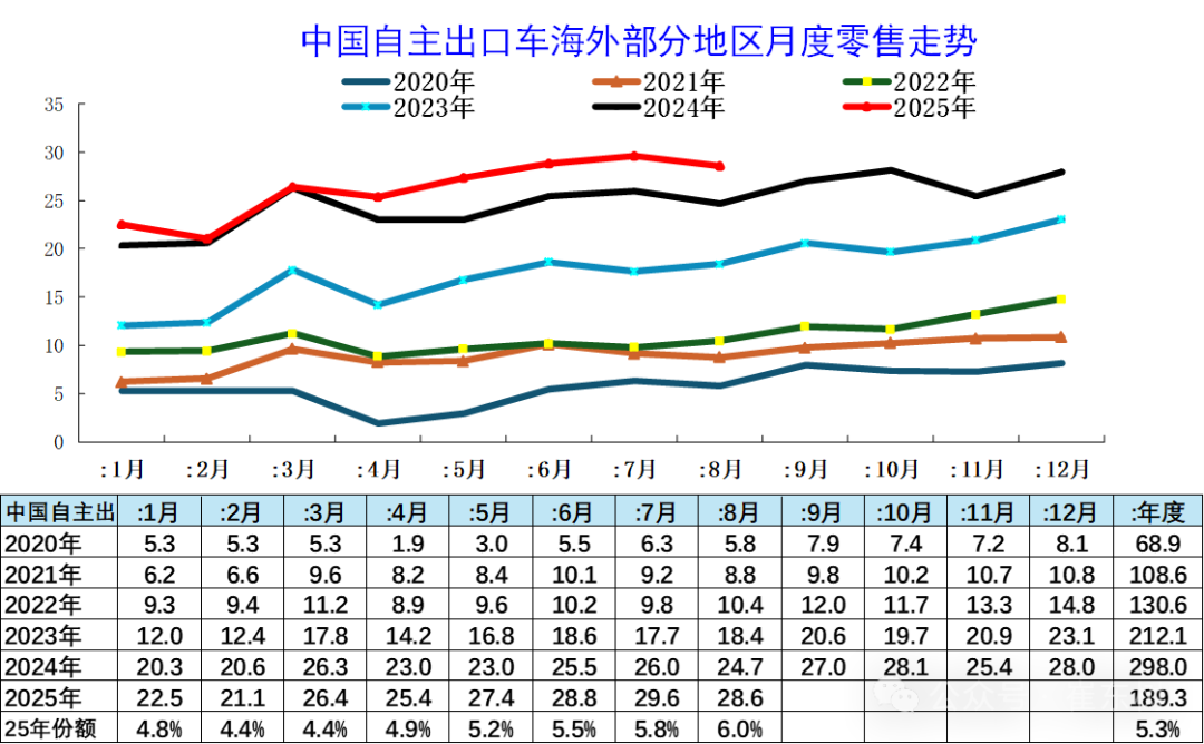 智通财经APP获悉,乘联分会秘书长崔东树发文称,2025年8月中国自主车企在海外部分能持续统计的地区的当地销量初步统计达到28.6万台,同比增长16%,环比降3%;2025年1-8月的中国海外市场自主品牌销量210万台,同比增长11%,中国自主的海外部分可统计市场的零售表现很好。