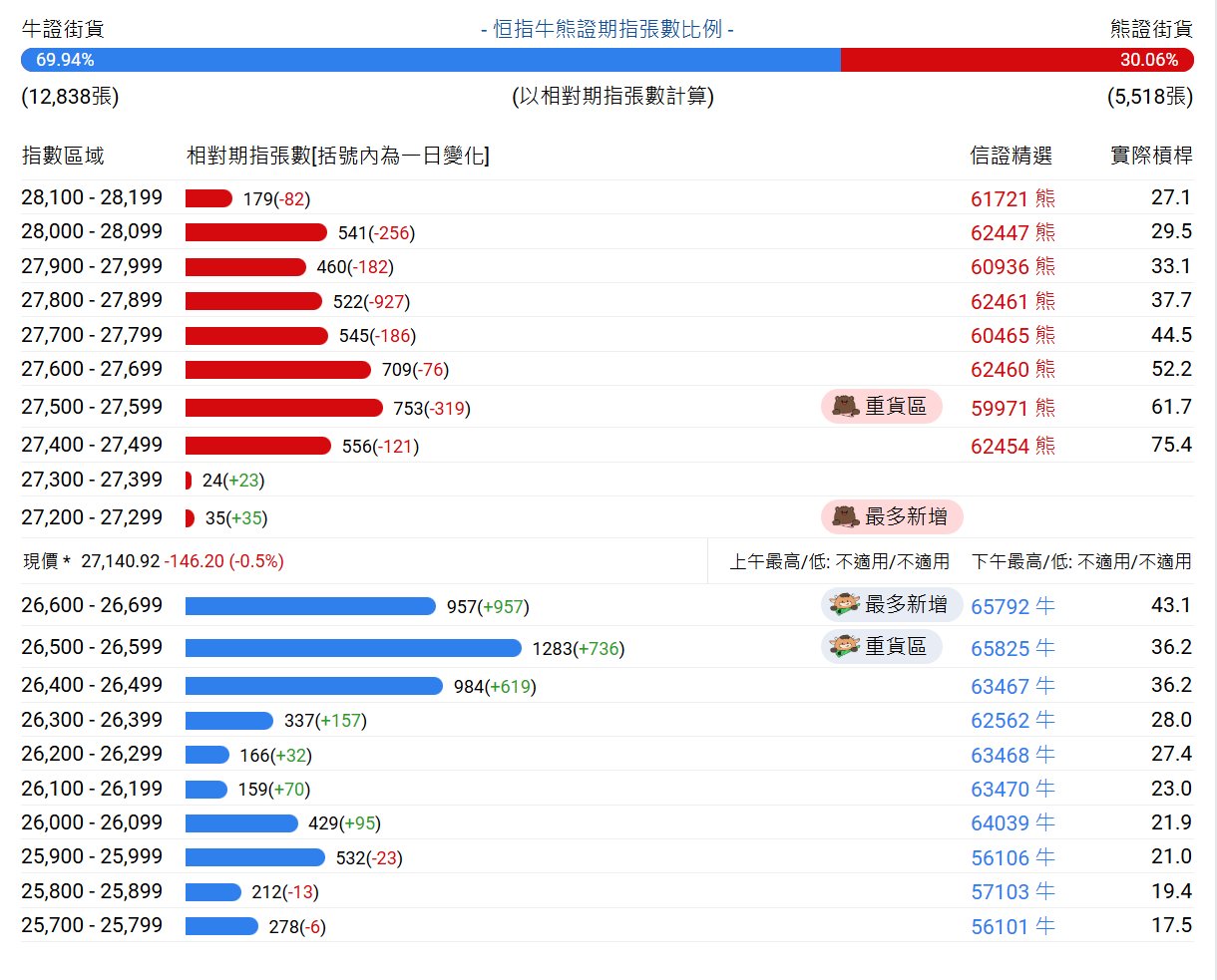 牛证街货重货区在26500- 26599区间,该区间最新牛证数量为1283张,较上一交易日增加736张;牛证街货最多新增在26600 - 26699区间,该区间最新牛证数量为957张,较上一交易日增加957张。