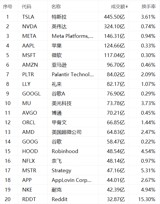 周三美股成交额第1名特斯拉收高3.31%再创年内新高,成交445.50亿美元。