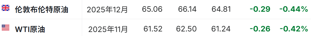 3.截至发稿,WTI原油跌0.42%,报61.52美元/桶。布伦特原油跌0.0.44%,报65.06美元/桶。