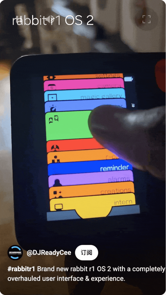 Rabbit OS2 引入了全新的卡片式界面设计,以一叠五颜六色的“卡片”呈现设备功能。这种设计使操作更加直观,用户可以通过触摸屏手势或侧边滚轮翻动卡片,快速查看并访问 R1 的各项功能。