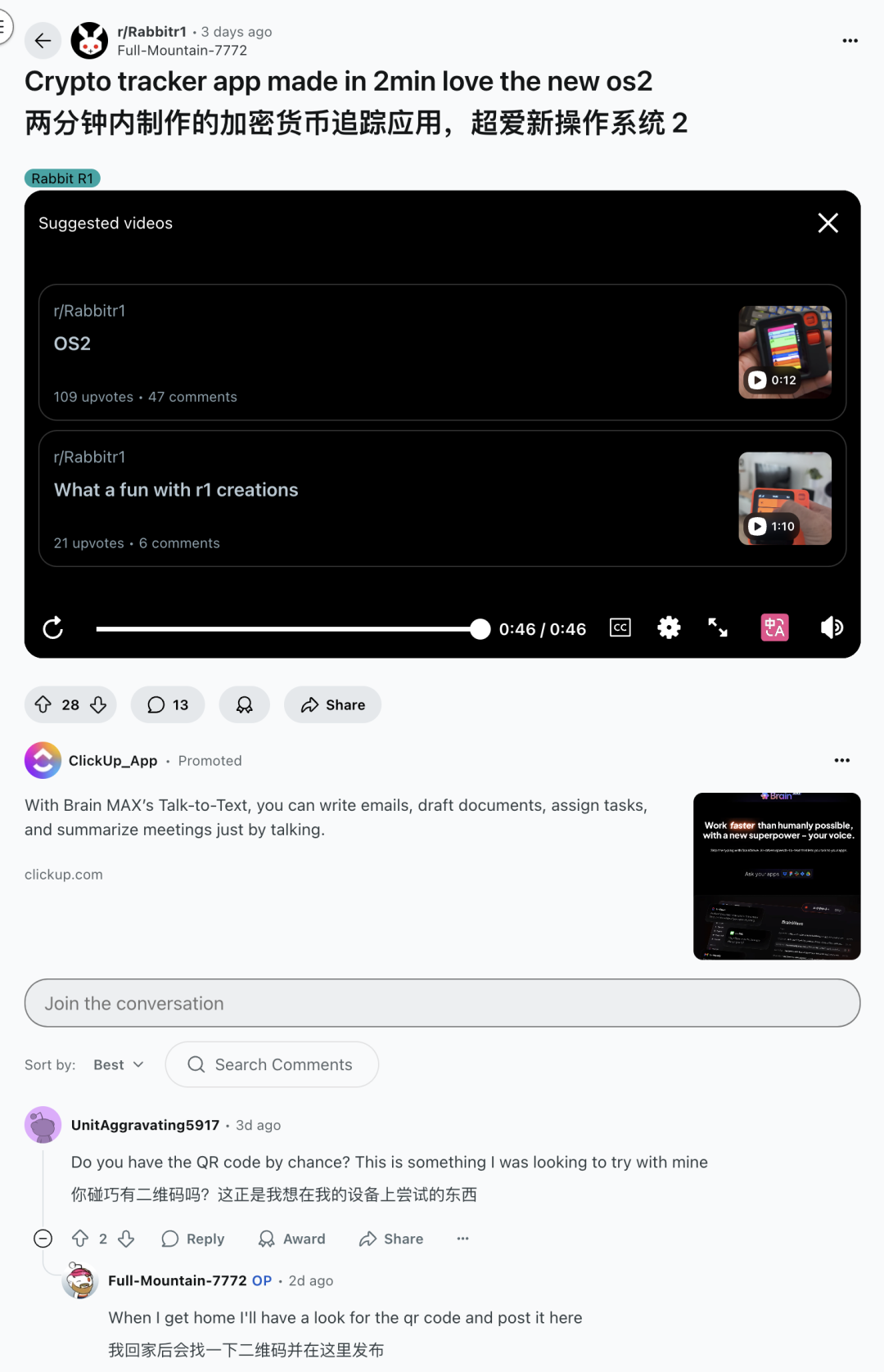 Rabbit 团队表示,“Creations”的推出标志着一种新形式应用商店的雏形,让 R1 的生态更具开放性和创造力。能通过二维码分享自己的作品,极大地刺激了社区活跃度。现在能在很多案例的评论区看到,“有码吗?”