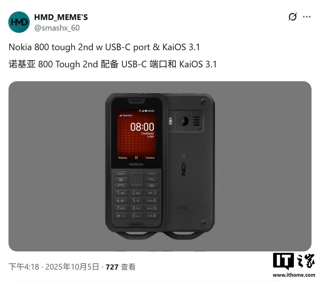IT之家 10 月 6 日消息,消息源 @smashx_60 昨日(10 月 5 日)在 X 平台发布推文,曝料称 HMD Global 计划更新诺基亚 800 Tough 三防功能机,在保留原版设计前提下,端口升级到 USB-C 接口,系统升级到 KaiOS 3.1 版本。