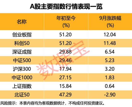 上证指数9月累计涨幅为0.64%,最新报3882.78点。创业板指9月累计上涨12.04%,科创50指数累计上涨11.48%,深证成指累计上涨6.54%;北证50指数9月下跌2.9%,跌幅居前。