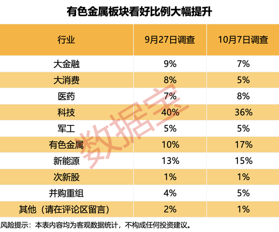 对于节后A股市场的潜力板块和方向选择,以下两大板块较受关注。有色金属环比提升7个百分点,最新为17%,是受访者最为看好的板块;新能源看好比例提升2个百分点至15%。