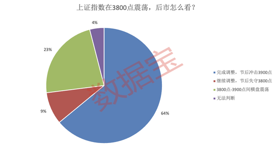 对于节后A股走势,最为主流的看法是“完成调整,节后冲击3900点”,占比达到64%;第二大占比的看法是“3800点~3900点间横盘震荡”,占比23%;“继续调整,节后失守3800点”的占比较小,为9%。