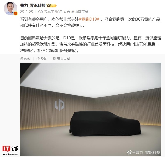 上个月,零跑科技高级副总裁曹力发文透露,零跑 D19 是一款承载零跑十年全域自研能力,且有一流供应链加持的超级旗舰车型,将带来突破性的行业首发黑科技,解决用户出行的“最后一块短板”。