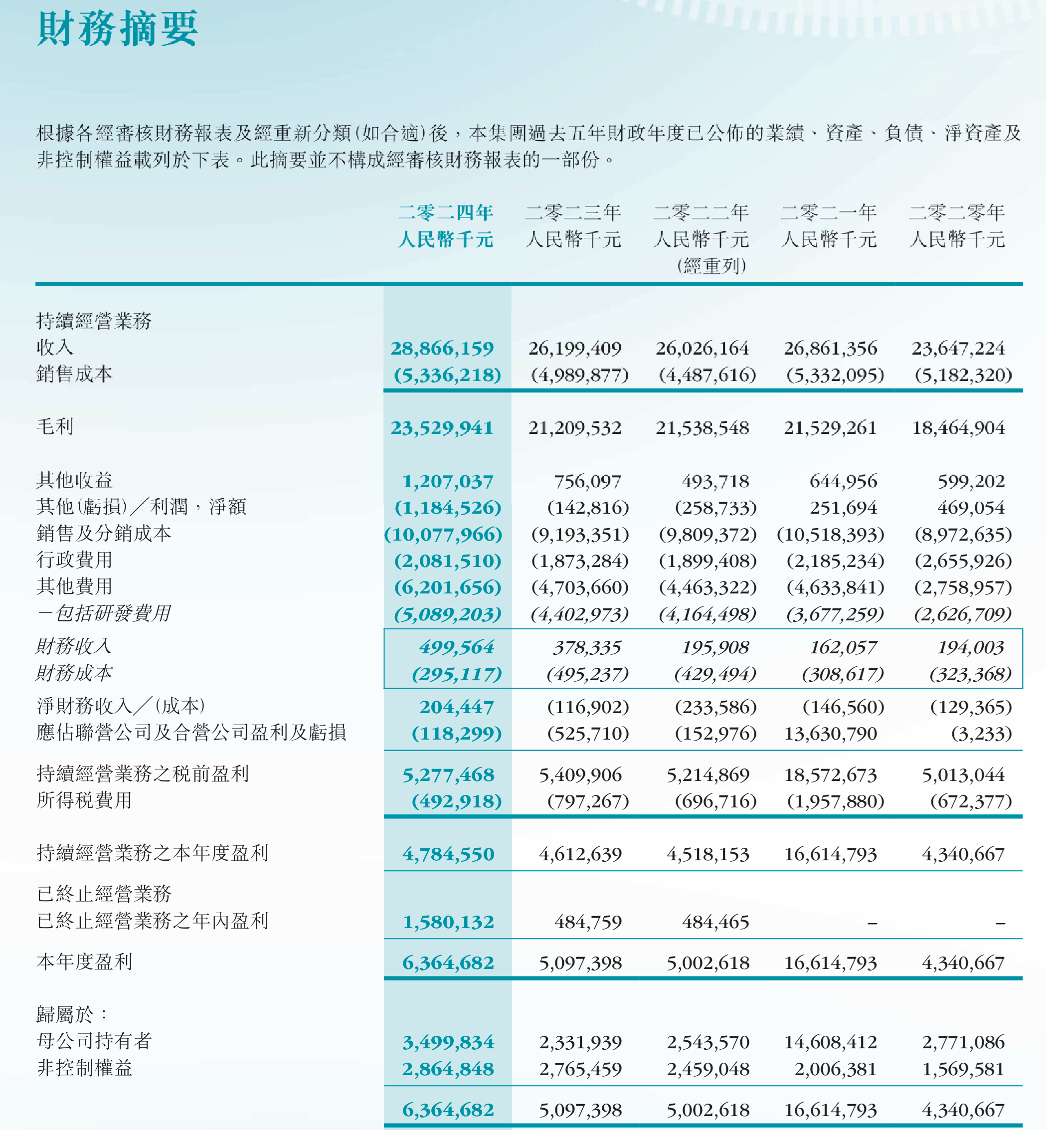 金吾财讯 | 中国生物制药有限公司 SINO BIOPHARMACEUTICAL LTD.股票代号:1177市盈率:39倍预测市盈率:33倍每股盈利:$0.20市值:$1500亿业务类别:保健护理用品集团主席:谢其润主要股东:谢承润(21.6%)5年业绩年度:2020/2021/2022/2023/2024收益(亿人民币):237/269/288/262/289毛利(亿人民币):185/215/230/212/235盈利(亿人民币):27.7/146/25.4/23.3/35.0每股盈利(港元):0.18/0.95/0.16/0.14/0.20每股股息(港元):0.08/0.08/0.12/0.05/0.07毛利率:78.1/80.2/79.9/80.9/81.5ROE:17.5/62.1/8.47/7.75/11.2--企业简介--中国生物制药(中生制药)是中国领先的创新研究和开发的医药集团,业务覆盖医药各种研发平台、智能化生产和强大销售体系全产业链。其产品包括多种生物药和化学药,在肿瘤、肝病、心脑血管病、镇痛、呼吸系统用药、骨科疾病等多个极具潜力的治疗领域处于优势地位。