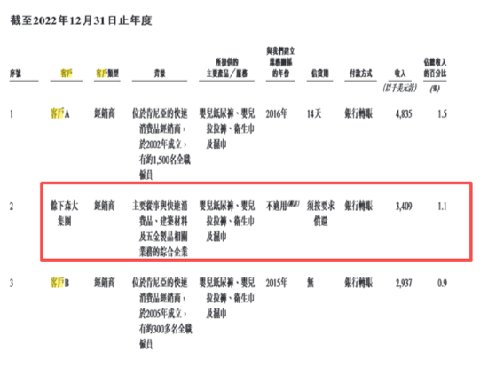 据公司招股书,2022年,森大集团是乐舒适第二大客户,采购乐舒适婴儿纸尿裤、拉拉裤、卫生巾及湿巾产品,采购总金额为340.9万美元。