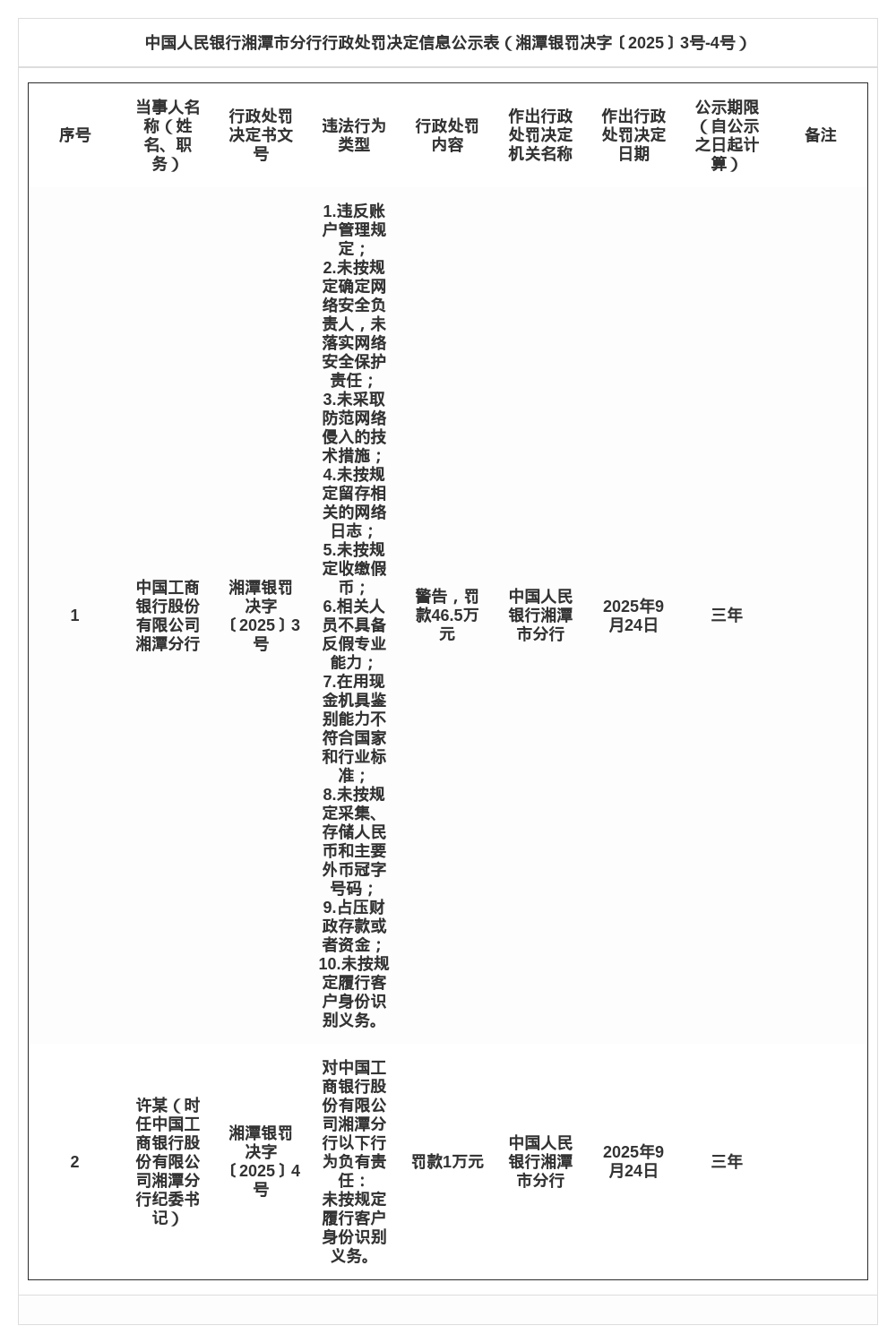 此外,时任中国工商银行股份有限公司湘潭分行纪委书记的许某,因对未按规定履行客户身份识别义务的行为负有责任,被处1万元罚款。