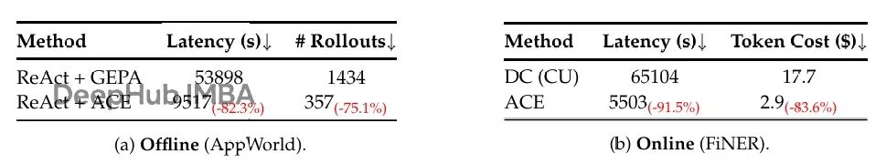 举例来说,AppWorld离线适应上,ACE相比GEPA达到82.3%适应延迟减少和75.1% rollout数量减少(表4a)。FiNER在线适应上,ACE相比DC达到91.5%适应延迟减少和83.6% token dollar成本减少(表4b)。