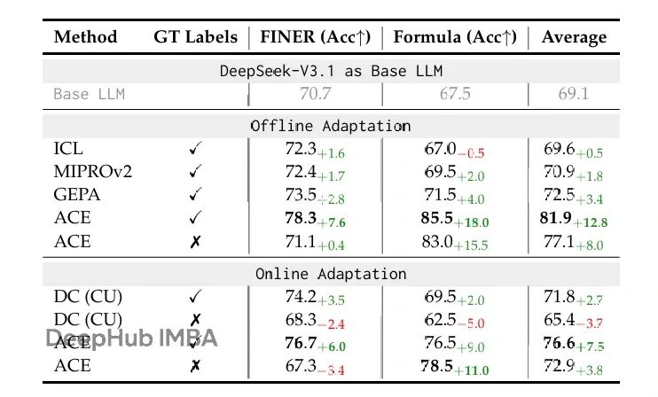 另外,也观察到当ground-truth监督或可靠执行信号缺失时,ACE和DC都可能性能下降。这种情况下构建的上下文可能被虚假或误导性信号污染,凸显推理时适应在没有可靠反馈时的潜在限制。这表明虽然ACE在丰富反馈下(比如agent任务里的代码执行结果或formula正确性)很鲁棒,但其有效性依赖于允许Reflector和Curator做出合理判断的信号可得性。