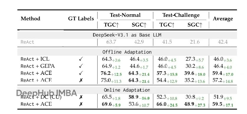 在agent用例里,ACE即使在适应期间没有ground-truth标签也保持有效:这个设置下ReAct + ACE比ReAct baseline平均改进14.8%。这种鲁棒性源于ACE利用执行期间自然可得的信号(比如代码执行成功或失败)来指导Reflector和Curator形成结构化的成功失败教训。