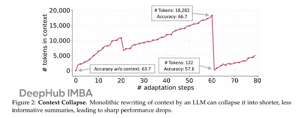 论文在AppWorld benchmark上做了个实验来观察这个现象。当LLM被要求在每个适应步骤完全重写累积的上下文时,上下文会发生崩溃。第60步时上下文有18,282个token,准确率66.7%,但下一步就崩溃到122个token,准确率掉到57.1%——比不适应的baseline 63.7%还差。虽然论文用Dynamic Cheatsheet举例,但这不是那个方法特有的问题,而是用LLM端到端重写上下文的根本风险——累积的知识可能突然被抹掉。