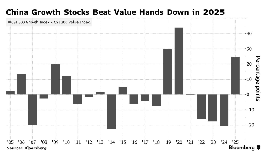 根据统计机构汇编的数据,中国沪深300成长指数(CSI 300 Growth Index)今年以来的指数级表现已超过沪深300价值指数大约25个百分点,有望创下近二十年来的最佳年度超额收益表现。
