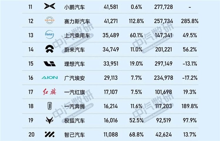 小米在9月销量达到41948辆,榜单排名第十。没错,小米汽车销量竟然超越了小鹏、赛力斯。这三家的汽车销量十分接近,小鹏销量为41581辆,赛力斯则为41271辆。