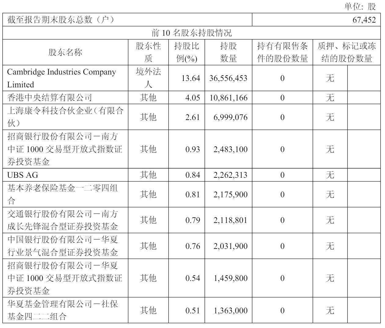 截至2025年6月30日,Cambridge Industries Company持股为13.64%,香港中央结算有限公司持股为4.05%,上海康令科技合伙企业(有限合伙)持股为2.61%,招商银行股份有限公司-南方中证 1000 交易型开放式指数证券投资基金持股为0.93%;