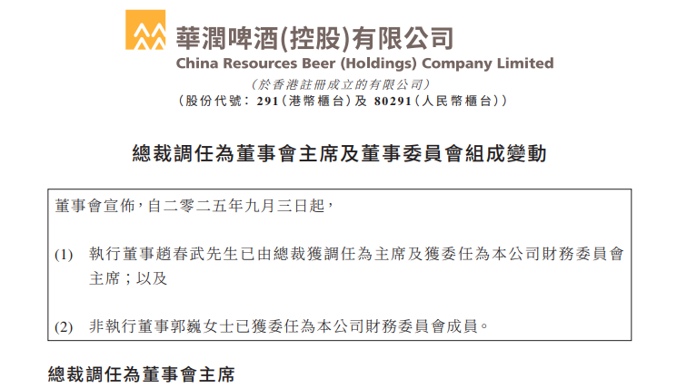 代理两个多月后的9月3日,赵春武转正,正式出任华润啤酒董事会主席一职,并担任财务委员会主席。同时,华润啤酒还任命非执行董事郭巍出任财务委员会委员。