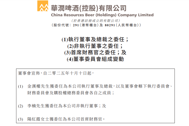 10月10日,华润啤酒发布人事任命相关公告,金汉权获委任为公司执行董事及总裁,以及董事会辖下执行委员会、财务委员会及购股权总务委员会各自之成员。同时,李楠获委任为华润啤酒非执行董事,阳红霞获委任为华润啤酒首席财务官。