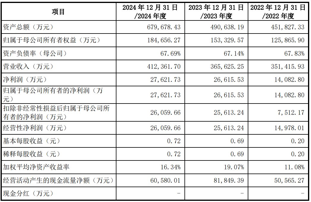 财务方面,于2022年度、2023年度、2024年度,公司实现营业收入分别约为35.14亿元、36.56亿元、41.24亿元,同期实现净利润分别约为1.41亿元、2.66亿元、2.76亿元人民币。