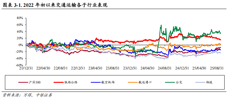 以来,上证综指、沪深300累计涨跌幅分别为+16.27%、+17.33%,交通运输指数-0.15%;交通运输各个子板块来看,铁路公路-11.32%、航空机场-2.56%、航运港口+3.59%、公交+9.61%、物流+9.96%。