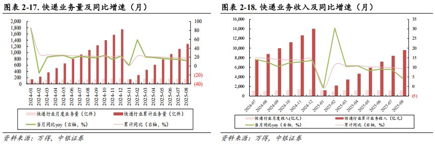 2025年8月快递业务量同比上升12.29%,快递业务收入同比增加4.24%。2025年8月月度快递业务量161.5亿件,同比增加12.29%,环比减少1.52%,快递业务收入完成1189.6亿元,同比增加4.24%,环比减少1.39%;2025年1-8月累计快递业务量1282.0亿件,同比增加17.80%,2025年1-8月快递业务收入9583.7亿元,同比增长9.17%。
