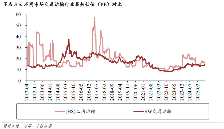 我们选择[HS]工用运输指数和[SW]交通运输指数进行对比,截至2025年10月10日,上述指数的市盈率分别为22.03倍、14.26倍。