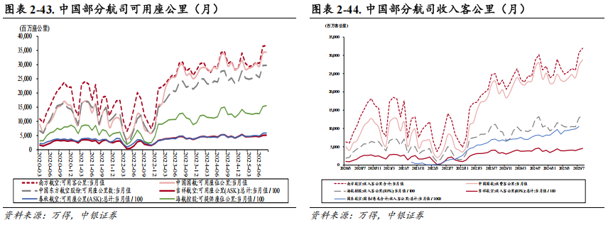 2025年8月吉祥、春秋、国航、南航、东航、海航ASK已超19年同期。可用座公里(ASK)方面,2025年8月,南航、国航、东航可用座公里分别相对去年同比增长6.22%、2.28%、6.76%,恢复至19年同期的112.06%、128.07%、119.60%;吉祥、春秋、海航8月可用座公里恢复至19年同期的140.23%、142.68%、89.00%,部分航司已远超疫情前水平。收入客公里(RPK)方面,南航、国航、海航、吉祥8月收入客公里分别同比+0.80%、+5.97%、+3.23%、+3.05%,南航、国航、海航、吉祥已恢复至19年同期的103.29%、175.62%、239.53%、186.52%。